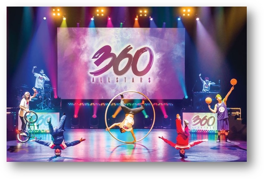 A phenomenal physical performance exploring all forms of rotation, 360 ALLSTARS connects the street with the elite to deliver a supercharged urban circus. Boasting a stellar cast of World Champion and World Record-holding artists and athletes, 360 ALLSTARS is a spectacular fusion of the extraordinary artistry that emerges from street culture. Add to this a stunning live soundtrack delivered by award-winning musicians, coupled with spectacular video projections, 360 ALLSTARS is as aurally exciting as it is visually astounding. A magnificent, colorful, and astonishing expression of a generation that has reinvented the circus, 360 ALLSTARS is a revolutionary production that will leave you dizzy with excitement!