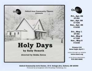 Set in 1935 during the Kansas Dust Bowl, Holy Days offers an elegiac window into the lives two couples—brothers Gant and Will and their wives Rosie and Molly—as they face the scarcity and separation of a community in decline. As they move through personal grief and communal hardship during the three holy days of Good Friday, Holy Saturday, and Easter Sunday, old wounds are reopened, loss is balanced on the brink of revelation, and all that is certain is that things must change.